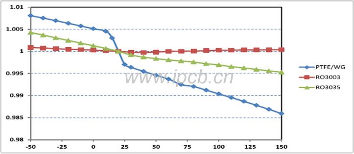 同样得益于该复合材料的应用,RO3003 PTFE陶瓷材料在X和Y方向的热膨胀系数为17ppm/℃,与铜的热膨胀系数相当,从而可以让材料因蚀刻收缩(蚀刻后烘烤)的典型值低于0.5mil/inch,表现出极好的尺寸稳定性。其Z方向的热膨胀系数为25ppm/℃,即使是在严酷的温度环境下,仍可保证电镀通孔的稳定性。